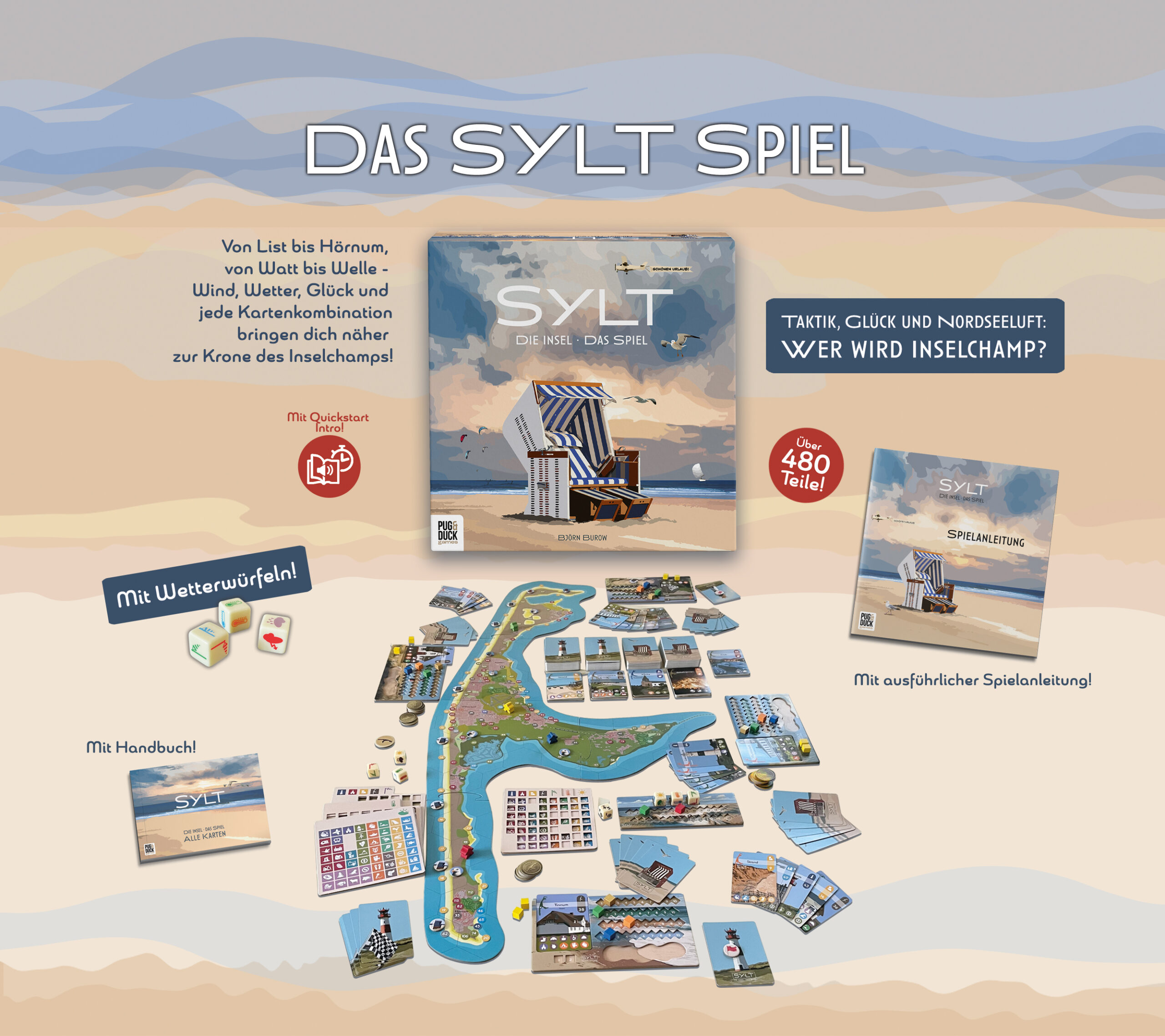 Eins ist klar: auf Sylt gibt es kein schlechtes Wetter. Das besondere: Mit einem absolut neuen und innovativen Wettermechanismus verbindet das Sylt Spiel Taktik und Zufall: Gewürfelte Wetterlagen und mögliche Kartenkombinationen beeinflussen direkt, welche Aktivitäten den Spielern offenstehen. Drei Wetterwürfel für Temperatur, Wind und Niederschlag ermöglichen dabei bis zu 100 unterschiedliche Wettersituationen, die mit den Wetterkarten dargestellt werden – so verläuft jede Spielrunde anders.